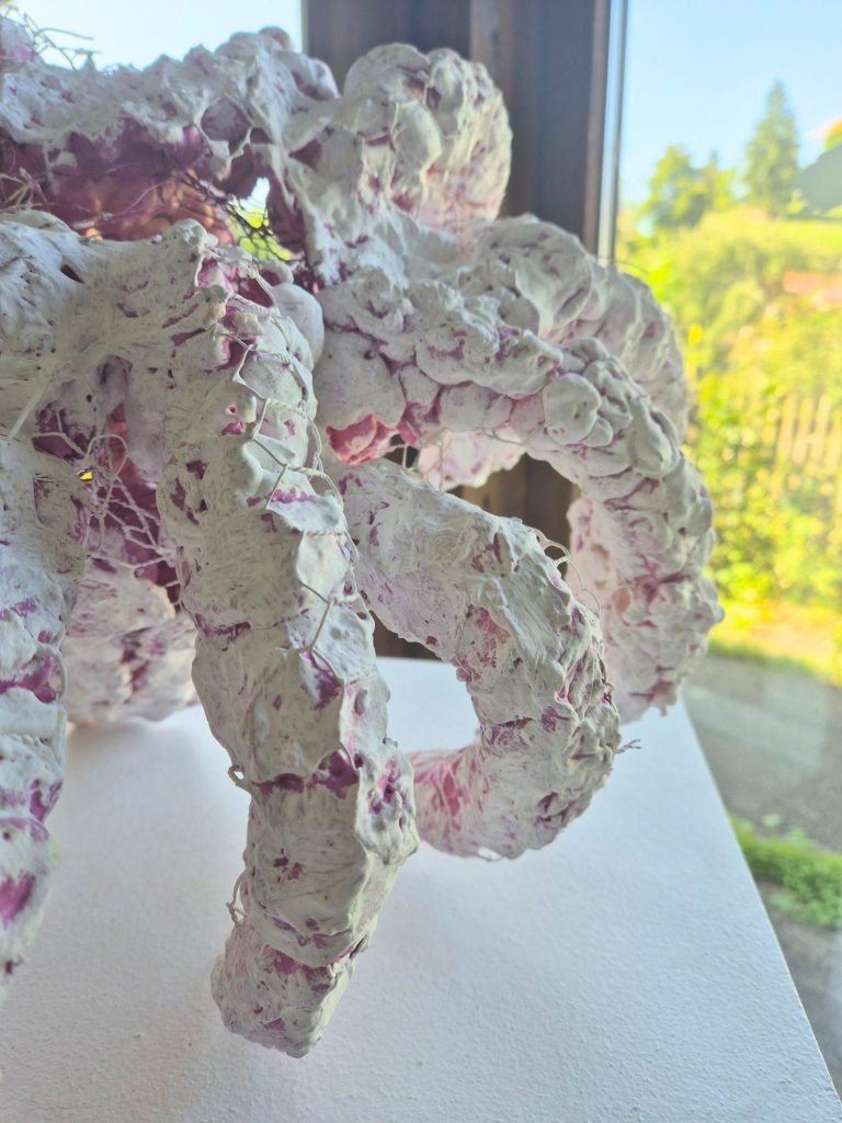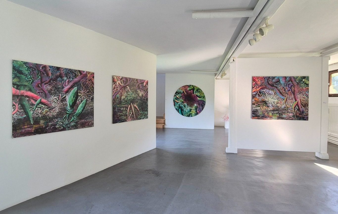 Sie skizziert Szenarien die vertraut wirken, aber nicht verorten werden können. Rätselhafte Formen leiten unsere Assoziationen. Ihre Bilderwelten scheinen in ständiger Bewegung; mal mit Weitblick, an anderer Stelle ein undurchdringliches organisches Dickicht. Ein Wechsel der Malerei zwischen Einzel-organismen und dem Kollektiv als naturgegebene Verbindung, umgeben von ausufernden Objekte, die durch die Materialwahl Verfall und Zerstörung kontrastieren.